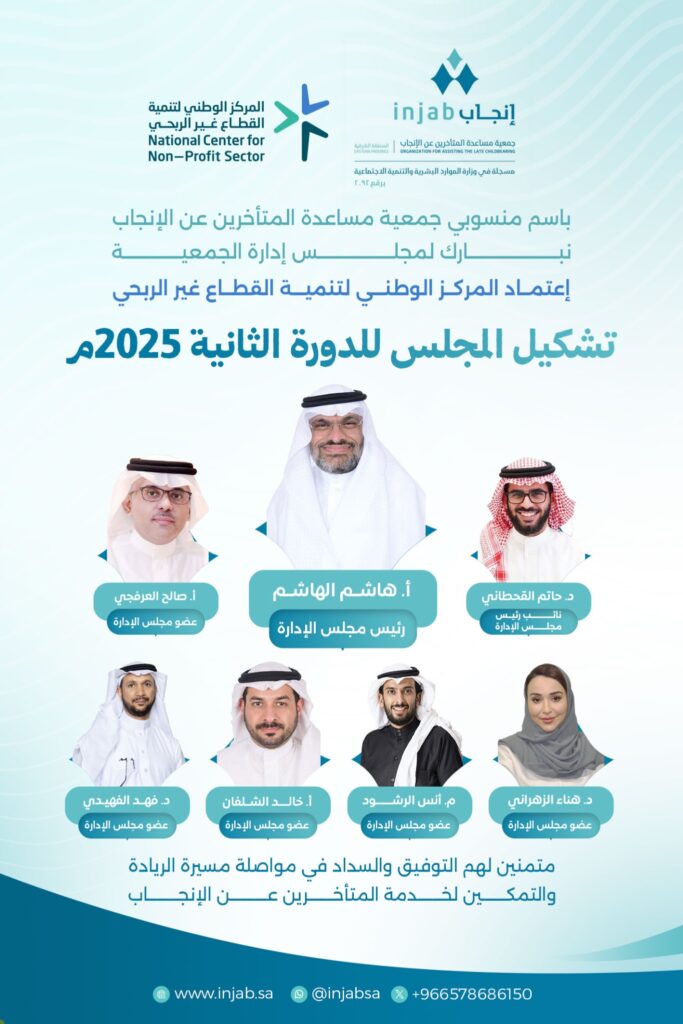 بإسم منسوبي جمعية مساعدة المتأخرين عن الإنجاب، يسرنا أن نتقدم بأسمى آيات التهاني والتبريكات لمجلس إدارة الجمعية بمناسبة اعتماد المركز الوطني لتنمية القطاع غير الربحي تشكيل المجلس (للدورة الثانية) لعام 2025م. نسأل الله العلي القدير أن يوفقهم ويسدد خطاهم، وأن يعينهم على مواصلة مسيرة العطاء والريادة في تمكين ودعم المتأخرين عن الإنجاب، وتحقيق المزيد من الإنجازات التي تخدم المجتمع. مع خالص التمنيات بدوام التوفيق والنجاح
